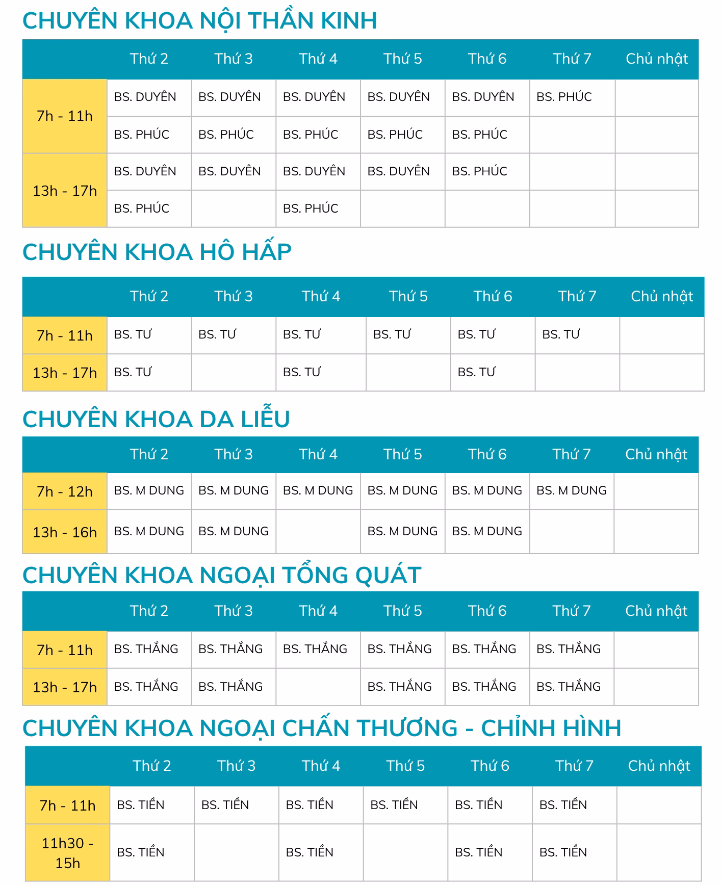 Do đó, quý khách hàng hoàn toàn có thể yên tâm về thời gian và quá trình thăm khám, xét nghiệm có thể thuận tiện cho quý khách hàng. Quý khách có thể theo dõi lịch làm việc của đội ngũ bác sĩ chuyên môn của Vạn Phước Cửu Long tại bảng bên dưới, chúng tôi sẽ cập nhật thường xuyên.